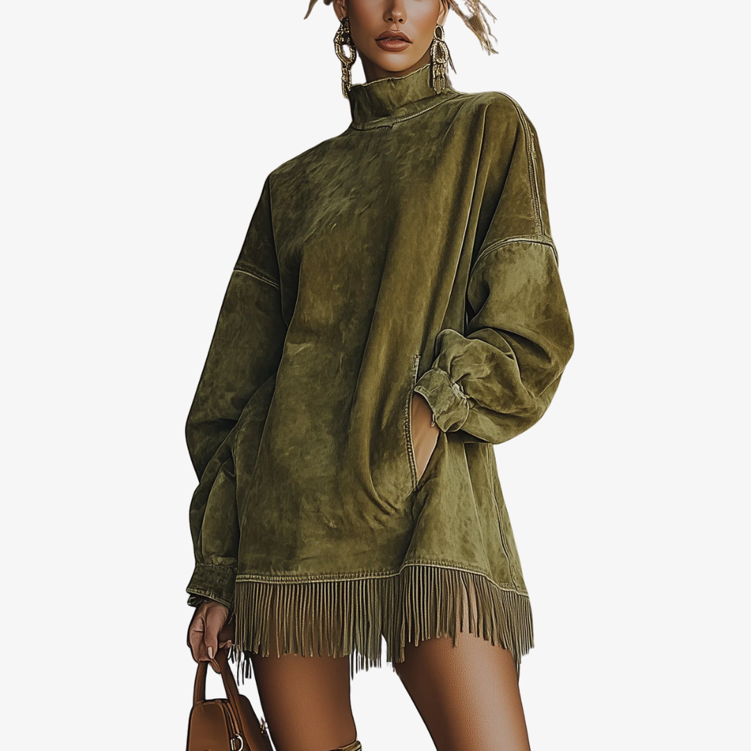 This suede-effect dress brings together relaxed sophistication and free-spirited bohemian style. Crafted from a soft, velvety fabric, it delivers exceptional comfort while maintaining a rich, refined look. The oversized silhouette and high neckline create a contemporary, laid-back shape—perfect for pairing with boots for casual days or heels for elevated evenings. Decorative fringe along the hem adds a feminine touch full of movement and character.
