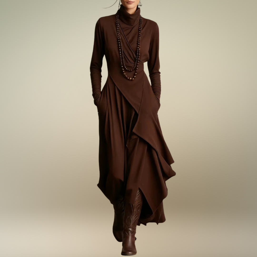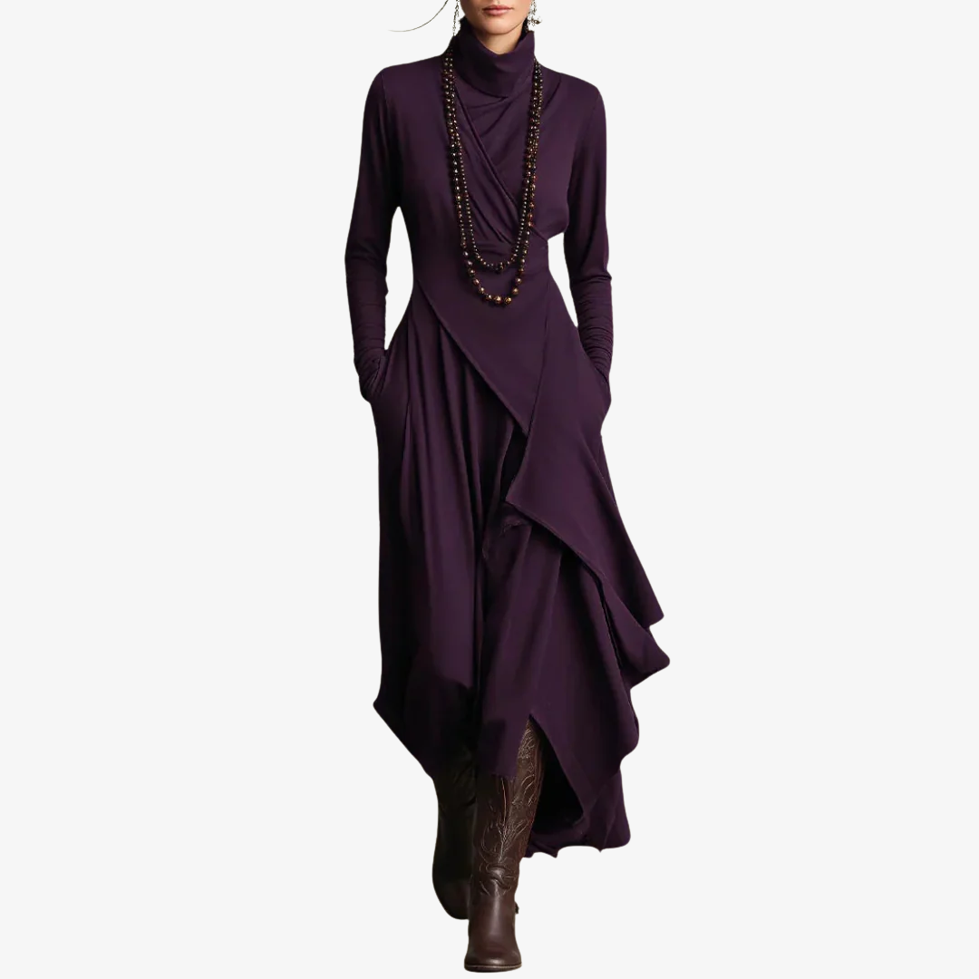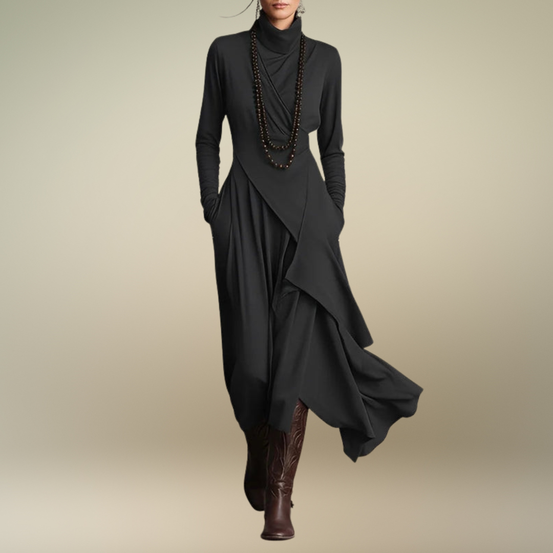 This asymmetrical maxi dress blends a sleek, fluid drape with a refined high turtleneck for a strikingly elegant silhouette. The soft, high-quality fabric moves beautifully with every step, while the unique cut adds a modern edge—perfect for creating effortlessly feminine looks all year round.