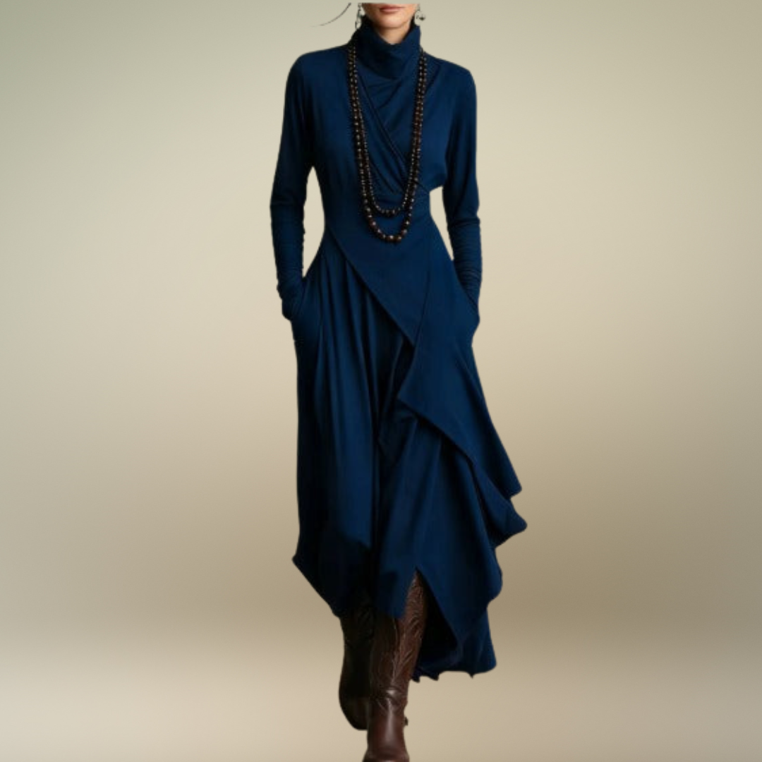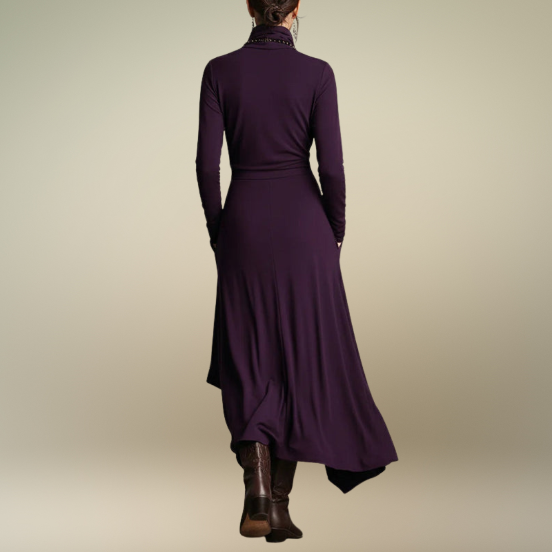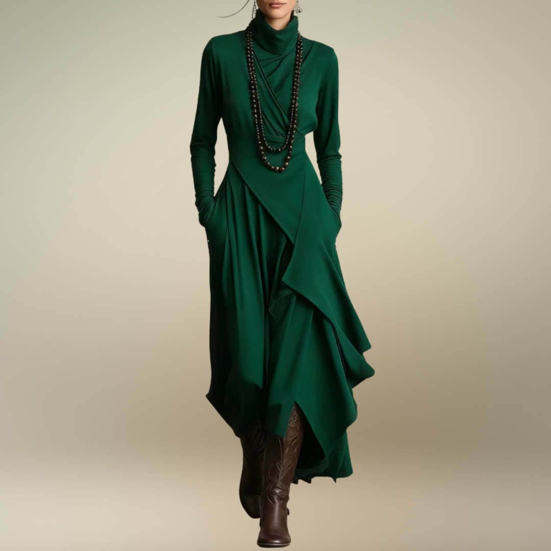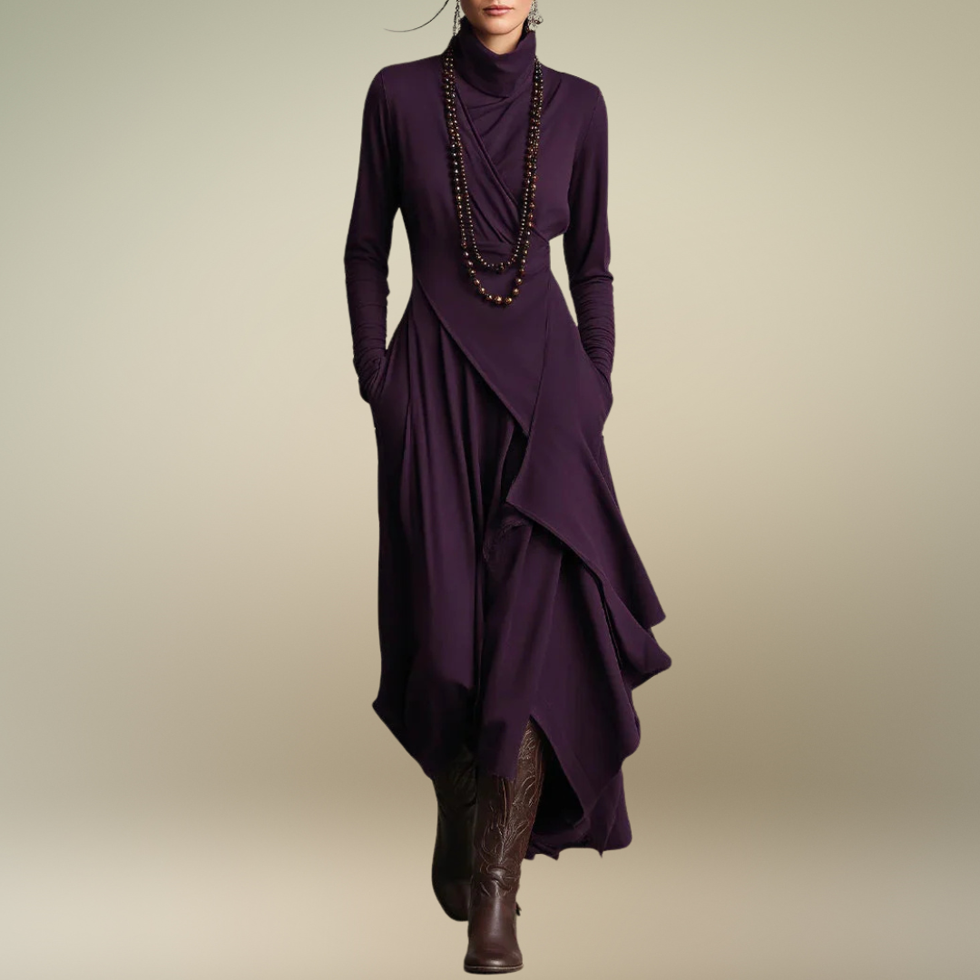 This asymmetrical maxi dress blends a sleek, fluid drape with a refined high turtleneck for a strikingly elegant silhouette. The soft, high-quality fabric moves beautifully with every step, while the unique cut adds a modern edge—perfect for creating effortlessly feminine looks all year round.